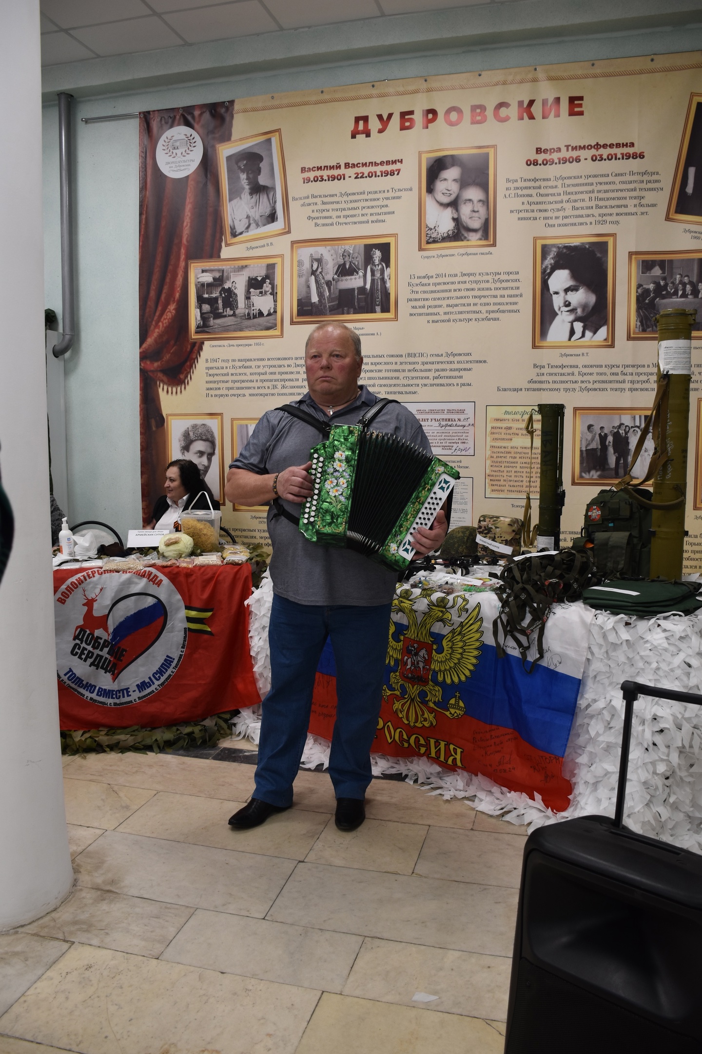 В фойе Дворца культуры была представлена выставка продукции, изготовленная для участников СВО волонтерами г.о.г. Кулебаки, выставка гармоней, была открыта для посещения новая экспозиция, посвященная кулебачанам - участникам СВО. Все гости фестиваля могли принять участие в мастер-классах и угоститься солдатской кашей.